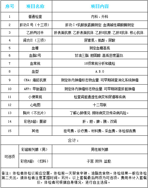 体检对于很多人来说不同需求,需要检查的项目是不同的。到底您适合哪种体检项目,以下是龙湖医院根据临床大多数人检查时所针对的一些主要项目汇总,所提供的套餐供大家参考,部分检查项目患者可根据具体情况增加或者相应减少进行调整,具体可咨询在线电话023-67500965。